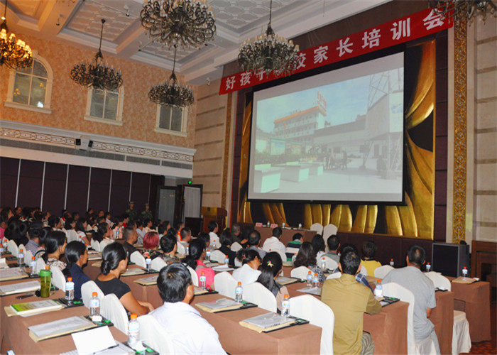 2014年8月9日下午,安寧市好孩子教育培訓(xùn)學(xué)校在舉辦了暑期家長(zhǎng)培訓(xùn)會(huì)。來自湖南、貴州、浙江及云南各州、市、縣的學(xué)生家長(zhǎng)共計(jì)216人參加了會(huì)議。學(xué)校校長(zhǎng)魯植、常務(wù)校長(zhǎng)匡建民、副校長(zhǎng)趙培亨、副校長(zhǎng)周榕樺、校長(zhǎng)助理李新紅、行政辦公室主任夏藝璇、總教官毛積敏等學(xué)校領(lǐng)導(dǎo)及部分班主任出席了會(huì)議。