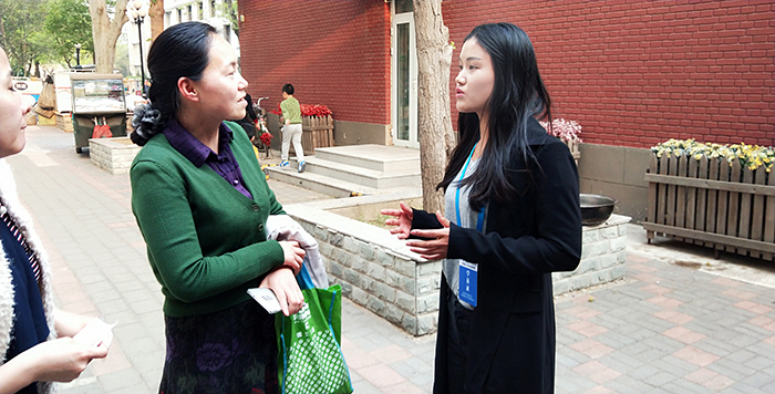 學(xué)校法學(xué)教師李月與最高人民檢察院未成年人檢查工作辦公室一處處長張寒玉(中)交談