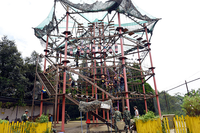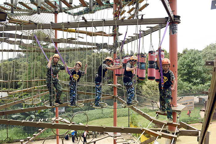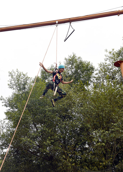 拓展活動在教練們的耐心講解和簡短的“戰(zhàn)前”熱身運動中拉開了帷幕。孩子們分成兩隊比拼,在各隊隊長的帶領(lǐng)下,分別組成了“紅軍隊”與“戰(zhàn)狼隊”,相應口號也立即產(chǎn)生,伴隨了各隊振奮人心、催人奮進的口號和加油聲,同學們陸續(xù)挑戰(zhàn)了巨人梯、空中抓杠、探險樂園等30余個項目。