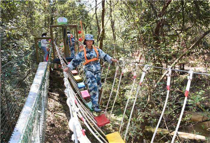 下午,孩子們?cè)凇皪{谷森林最美拓展大本營(yíng)”又開(kāi)始了一系列的高空挑戰(zhàn)項(xiàng)目,體驗(yàn)了這條“最美森林冒險(xiǎn)之旅”的時(shí)光隧道、鐵索連環(huán)、生命之門、單側(cè)過(guò)網(wǎng)等30個(gè)驚險(xiǎn)刺激關(guān)卡,其間還能看到彩蝶翩躚,藤蔓纏繞,腳下是清澈的山澗溪流。這是全國(guó)首個(gè)在峽谷森林中獨(dú)創(chuàng)、全程網(wǎng)絡(luò)化管理運(yùn)行的拓展大本營(yíng),全長(zhǎng)286米,全程趣味十足。雖然在挑戰(zhàn)過(guò)程中,有的孩子有過(guò)膽怯、有過(guò)害怕,但在老師們響亮的加油打氣聲中,孩子們沒(méi)有一個(gè)退縮、沒(méi)有一個(gè)放棄,憑借著頑強(qiáng)的毅力、堅(jiān)定的信念,全部通過(guò)了重重難關(guān)考驗(yàn)。