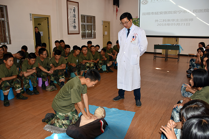 2018年5月21日下午,為全面提高全校學(xué)生對突發(fā)事故的科學(xué)、緊急救護(hù)能力,我校特邀請昆明市延安醫(yī)院安寧市人民醫(yī)院外二科主治醫(yī)師朱華、陸峻,護(hù)士胡亞瓊等專業(yè)醫(yī)護(hù)人員到校為孩子們開展應(yīng)急救護(hù)培訓(xùn)。