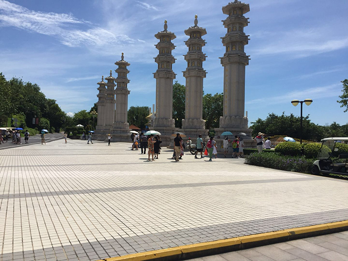 9日上午,第一站就是南海觀音。到了這里,大家頗為震撼。108米高的海上觀音圣像矗立在蔚藍(lán)色的大海之上,巍峨壯觀,實(shí)乃世界造像之最。敬建工程因其規(guī)模宏偉、意義殊勝、佛理底蘊(yùn)豐富,被譽(yù)為世界級(jí)、世紀(jì)級(jí)的佛事工程。那圣潔的白與純凈的藍(lán)融在一起,讓人不禁想到“海天佛國(guó)” 四個(gè)字!