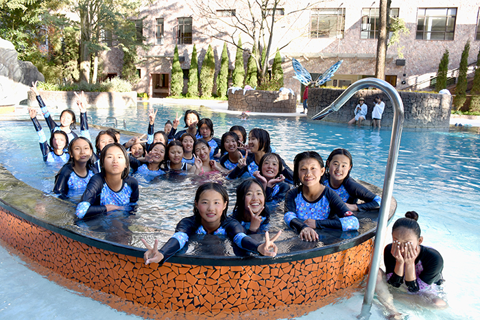泳池中,同學(xué)們還不時(shí)搞下惡作劇,上一秒還在友好地討論著如何提高游泳技術(shù),下一秒就趁其不備,開(kāi)始了水中的潑水大戰(zhàn),好似在過(guò)潑水節(jié),也讓人情不自禁聯(lián)想到冬天打雪仗的情景。此刻,想象和現(xiàn)實(shí)沒(méi)有差距,在水中,無(wú)論男生還是女生,都玩得不亦樂(lè)乎。盡情玩耍后,會(huì)游泳的孩子還開(kāi)始了游泳比賽,其他孩子自動(dòng)分為兩列站在水中,為比賽的同學(xué)加油打氣。游泳池中,顏色明快統(tǒng)一的泳衣,清脆開(kāi)心的歡笑聲,成了溫泉中一道亮麗的風(fēng)景線。說(shuō)來(lái)也神奇,在這樣的氛圍中,之前怯水的同學(xué)不知不覺(jué)就克服了恐懼心理,也能在水中自如地走來(lái)走去。