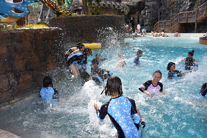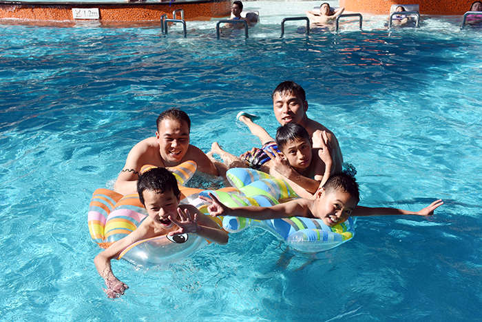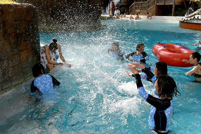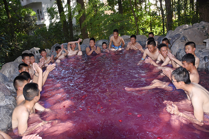 刺激項(xiàng)目體驗(yàn)結(jié)束后,孩子們成群結(jié)隊(duì)地到各種特色功能浴中一一享受。一入池中,大家便遙想起唐朝佳人楊貴妃溫湯美容的故事來(lái),更何況,溫泉中設(shè)有薄荷、牛奶、鮮花、檸檬等養(yǎng)顏潤(rùn)膚浴,這是對(duì)當(dāng)代人的恩寵,會(huì)令楊貴妃自嘆不如,去責(zé)怨唐玄宗白當(dāng)了一世皇帝,倒不如去做安寧的普通市民,可美美享受森林溫泉的美容浴。親親魚(yú)療池中,魚(yú)兒親密接觸腳掌的酥癢,讓孩子們不時(shí)咯咯地笑出聲來(lái),牛奶池、玫瑰池、中草藥池等等池中,更是留下了孩子們無(wú)數(shù)的歡聲笑語(yǔ)和吃著雪糕的無(wú)限滿足......有的池子本來(lái)容納不下太多人,但孩子們就是喜歡擠在一起,嬉戲調(diào)侃,不時(shí)擺拍留影,讓隔著屏幕看照片的人,都能感受到這個(gè)大家庭別樣的溫暖。