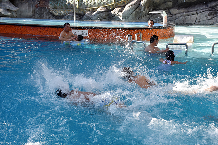 進(jìn)入溫泉,潔凈的游泳池立馬映入孩子們的眼簾,大家忍不住下去嬉戲。有的縱身一跳,扎一個(gè)猛子,已在池子的中央;有的小心翼翼扶著樓梯慢慢試著走入水中;有的膽怯怕水,有的個(gè)子小,遲遲不敢入水,老師就把提前準(zhǔn)備好的救生圈套在脖子上,并在旁邊加強(qiáng)保護(hù),扶著他們緩緩向水中其他同學(xué)靠近。放眼望去,有的同學(xué)水性好,一下去就像魚(yú)兒在水里歡快地游來(lái)游去,惹得不會(huì)游泳的同學(xué)羨慕不已,有的只敢站在水里,置身水中感受。孩子們?nèi)齻(gè)一群、兩個(gè)一伙地在水里靜靜放松身心,要不就是你給我捶捶背,我給你按按肩,亦或是在水中玩起了老鷹捉小雞的游戲。