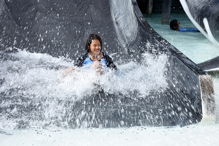 泳池中玩累了,孩子們稍作休息,便又元?dú)鉂M滿地開(kāi)始了各種驚險(xiǎn)刺激的水上項(xiàng)目挑戰(zhàn)。在湍急的出水口,在急速滑下而濺起的浪花中,孩子們開(kāi)懷大笑又有些驚險(xiǎn)的表情被記錄了一次又一次。同一個(gè)項(xiàng)目,一遍又一遍玩耍的熱情,一次又一次開(kāi)心的尖叫,讓我們感受到了孩子們火一樣的青春。