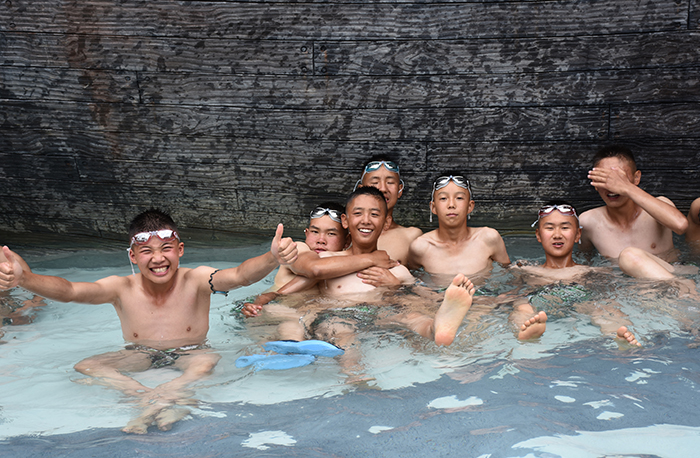 泳池中,同學們還不時搞下惡作劇,上一秒還在友好地討論著如何提高游泳技術,下一秒就趁其不備,開始了水中的潑水大戰(zhàn),好似在過潑水節(jié),也讓人情不自禁聯(lián)想到冬天打雪仗的情景。此刻,想象和現(xiàn)實沒有差距,在水中,無論男生還是女生,都玩得不亦樂乎。游泳池中,顏色明快統(tǒng)一的泳衣,清脆開心的歡笑聲,成了溫泉中一道亮麗的風景線。說來也神奇,在這樣的氛圍中,之前怯水的同學不知不覺就克服了恐懼心理,也能在水中自如地走來走去。