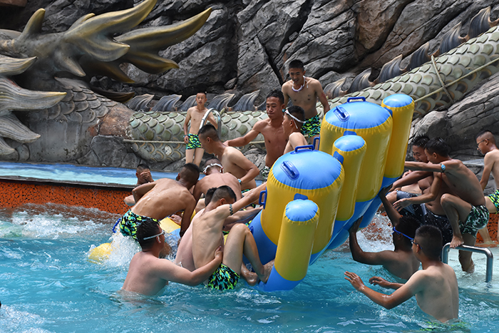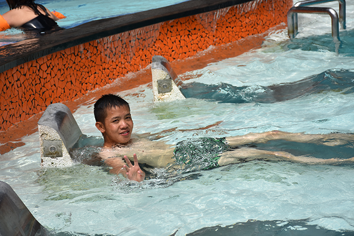 進入溫泉,潔凈的游泳池立馬映入孩子們的眼簾,大家忍不住下去嬉戲。有的縱身一跳,扎一個猛子,已在池子的中央;有的小心翼翼扶著樓梯慢慢試著走入水中;有的膽怯怕水,有的個子小,遲遲不敢入水,老師就把提前準備好的救生圈套在脖子上,并在旁邊加強保護,扶著他們緩緩向水中其他同學靠近。放眼望去,有的同學水性好,一下去就像魚兒在水里歡快地游來游去,惹得不會游泳的同學羨慕不已,有的只敢站在水里,置身水中感受。孩子們三個一群、兩個一伙地在水里靜靜放松身心,要不就是你給我捶捶背,我給你按按肩,亦或是在水中玩起了充氣船。