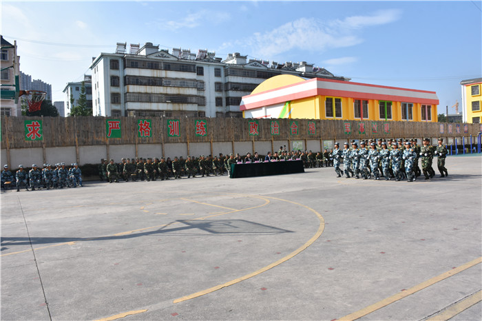隨后,進行了迎校旗儀式。緊接著,在洪亮的分列式進行曲中,學生們穿著統(tǒng)一的作訓(xùn)服,排著整齊的隊伍,喊著嘹亮的口號,昂首闊步、英姿颯爽地依次走過主席臺接受檢閱,盡顯青春風采。