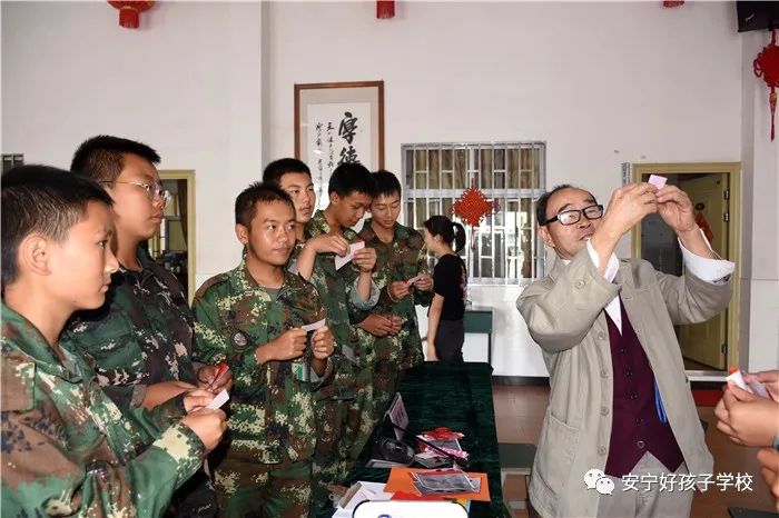 結(jié)合活動主題,耿老從簡單的剪“紅五星”及“法”字著手,再增加難度到“!薄ⅰ皣帧、“蜻蜓”等圖案,不厭其煩地講解折紙、裁剪角度等要領(lǐng)。同學(xué)們上下翻折著手中的彩紙,時而低頭思索,時而拿起來認(rèn)真對照圖樣,神情十分專注。在耿老的精心指導(dǎo)下,同學(xué)們一折、一剪、一展,剪紙仿佛有魔法一般,一個個栩栩如生的作品便躍然眼前,在場的人無不發(fā)出聲聲驚嘆。耿老還現(xiàn)場把孩子們裁剪的作品塑封好,分發(fā)給他們。孩子們拿著自己的“杰作”,紛紛拍照留念,舉在頭頂?shù)摹胺ā弊,也成了此次活動的點(diǎn)睛之筆。