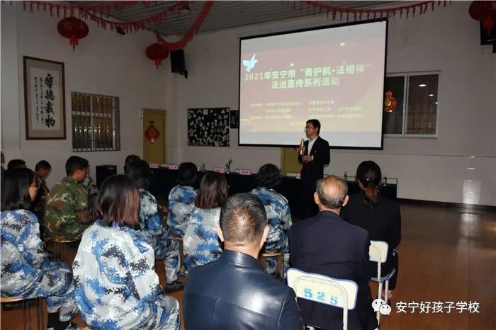 為加強(qiáng)青少年法治教育和思想道德教育,預(yù)防和減少未成年人違法犯罪,提高未成年人自我保護(hù)能力,推進(jìn)依法治市,建設(shè)平安安寧, 2021年4月9日上午, 由市委政法委、共青團(tuán)安寧市委、市人民檢察院、市關(guān)工委、市未司辦主辦,安寧市向日葵青少年事務(wù)服務(wù)中心、安寧好孩子學(xué)校承辦的“青護(hù)航•法相伴”法治宣傳系列活動(dòng)在我校多功能室舉行。市委政法委副書記李劍飛、市人民檢察院第四檢察部主任孫曉宇、市關(guān)工委專職副主任李庭貴、團(tuán)市委副書記徐濟(jì)炳、市人民檢察院和市關(guān)工委部分“五老”成員等領(lǐng)導(dǎo)出席了本次活動(dòng);顒(dòng)由團(tuán)市委副書記徐濟(jì)炳主持。