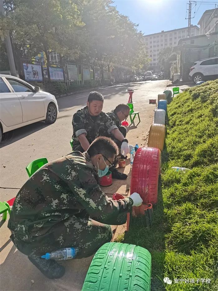 活動(dòng)前,老師首先給同學(xué)們講解了活動(dòng)的注意事項(xiàng),隨后便分發(fā)了彩繪輪胎所需的刷子、顏料等工具。同學(xué)們便興致勃勃地將輪胎擺出了好看的造型。有的放在花壇綠地上,有的放在小路兩邊,靜待華麗變身。