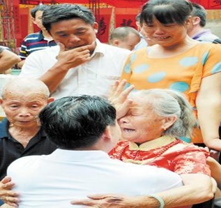 《北大校長(zhǎng)周其鳳回瀏陽慶祝母親90大壽 長(zhǎng)跪在母親膝前》的一組照片最先在瀏陽論壇上出現(xiàn)。組圖中,周其鳳跪在母親跟前,雙眼緊閉,緊抱著母親,母子兩人抱頭流淚,他看到母親老淚縱橫,輕輕為母親擦拭淚水,F(xiàn)場(chǎng)圍觀的群眾被這幅畫面所感動(dòng),有的鼓掌,有的跟著默默流淚。