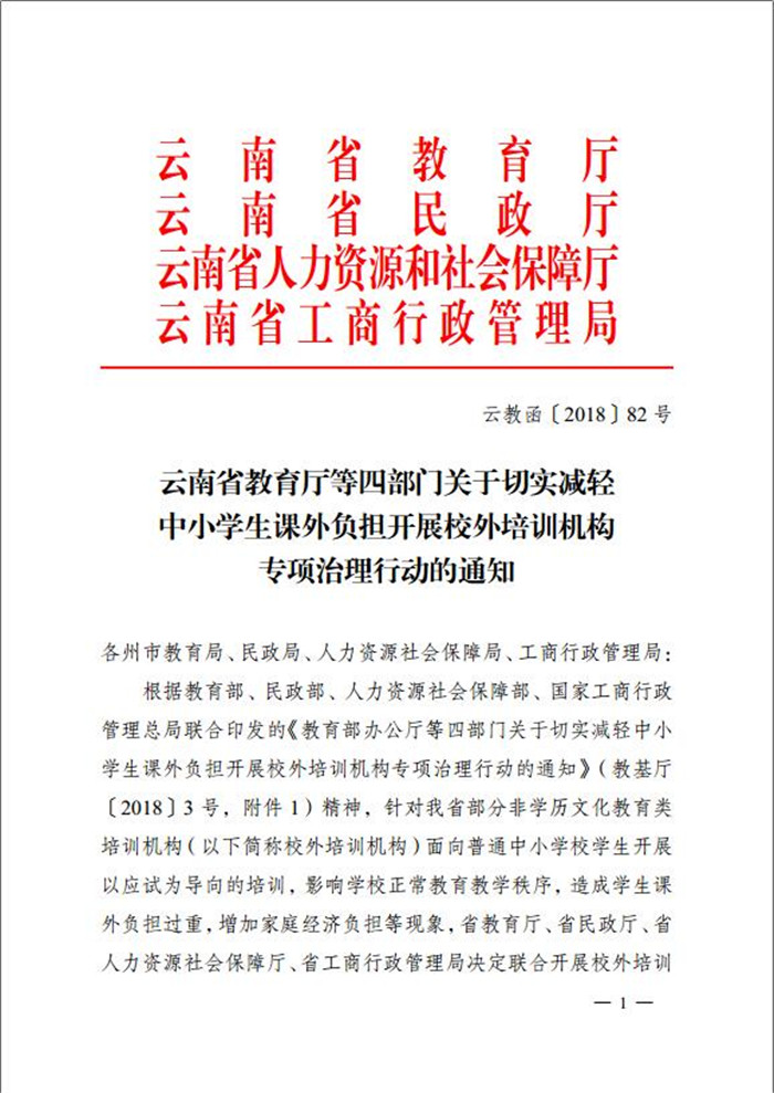 云南省教育廳等四部門關(guān)于切實(shí)減輕中小學(xué)生課外負(fù)擔(dān)開展校外培訓(xùn)機(jī)構(gòu)專項(xiàng)治理行動的通知