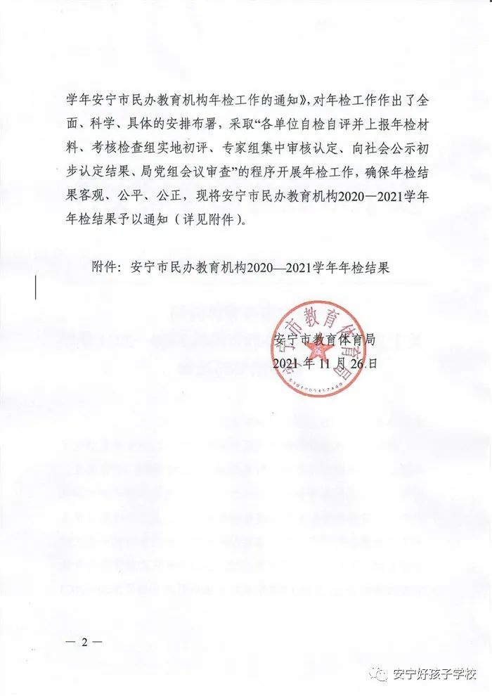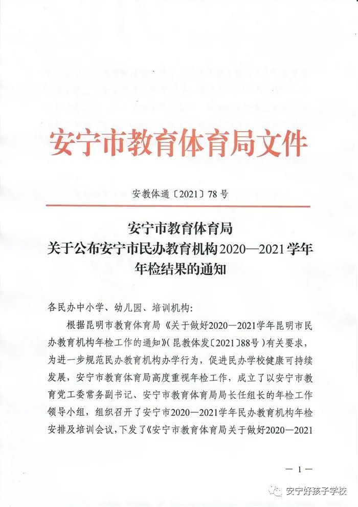 2021年12月3日,安寧市教育體育局發(fā)布了《關(guān)于2020—2021學(xué)年度安寧市民辦教育機(jī)構(gòu)年檢結(jié)果公示》,我校喜獲“2020—2021學(xué)年度辦學(xué)水平考核合格單位”榮譽(yù)稱號!