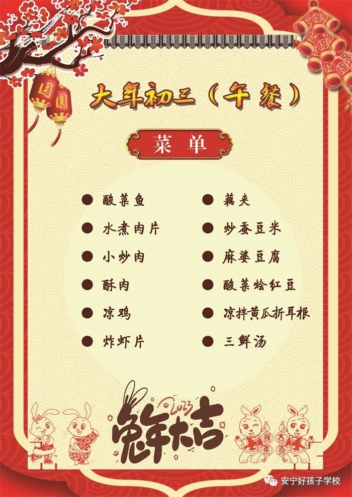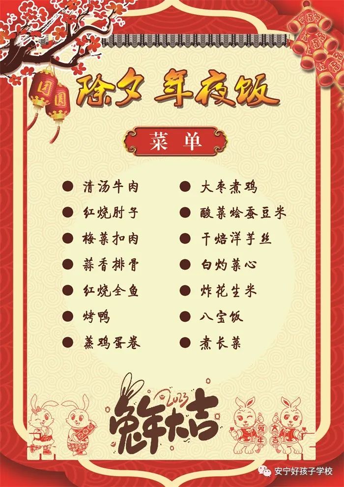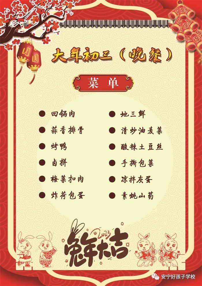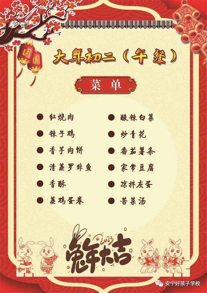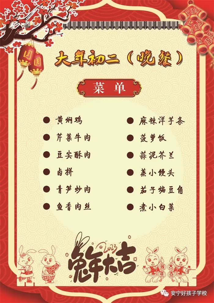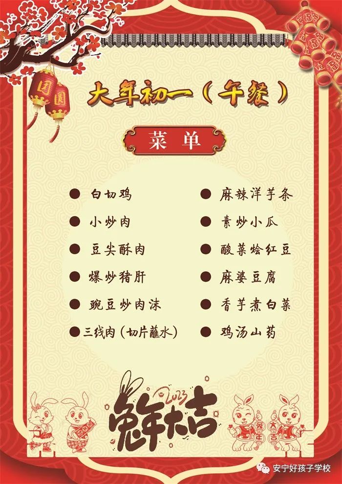 過年了 !孩子們吃什么?這是學校領導幾天來一直思考的問題。經過與學校營養(yǎng)師、食堂廚師們多次商議后,本著營養(yǎng)、健康、不浪費,又要保證孩子每餐都能吃上新鮮可口的飯菜,終于議定了菜單,現予以公布。祝孩子們新年快樂!祝全體家長兔年吉祥、闔家幸福安康!