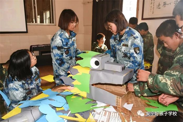 緊接著,同學(xué)們利用廢舊紙盒、卡紙和彩色氣球等原材料自主設(shè)計心目中的“祥龍”。大家奇思妙想,開動腦筋,既有分工,又有合作。有的制作龍頭,剪一剪、畫一畫、粘一粘;有的制作龍身,賣力地吹著氣球,認(rèn)真地綁著。很快,一條栩栩如生、五彩奪目的祥龍便呈現(xiàn)在大家眼前。