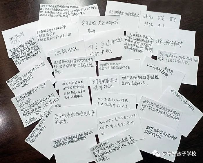 課程伊始,張老師首先通過“你為什么學(xué)習(xí)?”這一簡單提問,單刀直入、切入主題,孩子們?nèi)粲兴,爭相發(fā)言。隨后張老師又和孩子們進(jìn)行互動,要求孩子們在收到的小紙片上以匿名的方式寫下自己的想法。孩子們在紙片上暢所欲言,有的回答簡單直白,有的充滿童趣,有的誠懇務(wù)實。張老師挑選了部分答案進(jìn)行分享,課堂氛圍活躍了起來,孩子們熱情高漲。