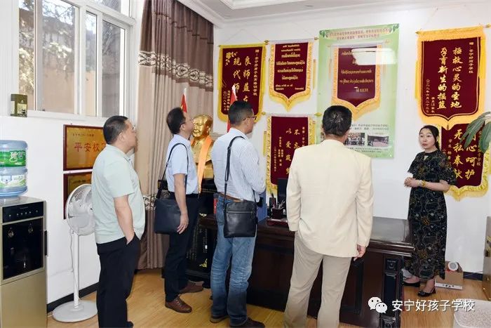 瞿會(huì)長(zhǎng)一行首先參觀(guān)了學(xué)校辦公樓、學(xué)生餐廳、教學(xué)樓、學(xué)生宿舍、心理輔導(dǎo)室等硬件設(shè)施,隨后與我校心理教研組長(zhǎng)趙松瑞老師做了沙盤(pán)交流,最后在多媒體教室觀(guān)看了教學(xué)活動(dòng)短片。其間,我校副校長(zhǎng)李新紅就學(xué)校的辦學(xué)理念、發(fā)展歷程、管理模式、辦學(xué)特色、辦學(xué)戰(zhàn)略定位、辦學(xué)效益等多項(xiàng)內(nèi)容逐一向領(lǐng)導(dǎo)們做了詳細(xì)介紹。執(zhí)行校長(zhǎng)尹斌對(duì)領(lǐng)導(dǎo)們提出的問(wèn)題一一做了解答,并就家庭教育做了深入交流。當(dāng)看著接待室那面印著老撾文的錦旗,瞿會(huì)長(zhǎng)非常震驚,他從未想過(guò)學(xué)校的生源除了省內(nèi)、國(guó)內(nèi)各地,竟也延伸到了國(guó)外,非常驚嘆學(xué)校的影響力。