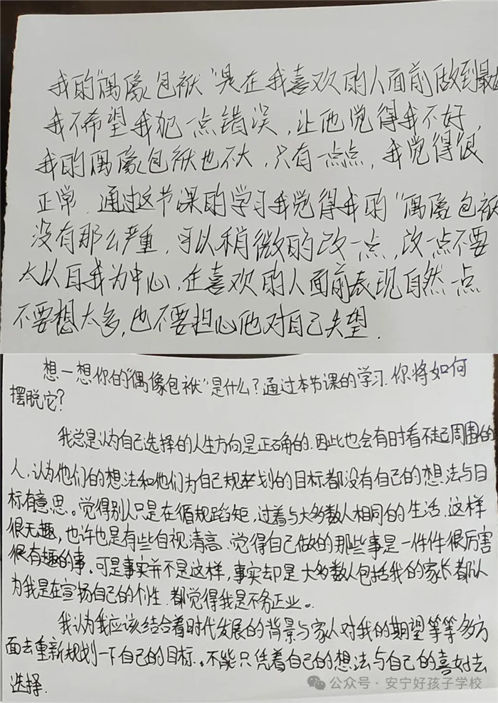 最后,在“我的偶像包袱”課程作業(yè)中也體現(xiàn)出了孩子們的收獲。有的孩子為自己以前總要求父母、朋友圍著自己轉(zhuǎn),把他們的好當(dāng)做理所當(dāng)然而感到后悔,表示以后會(huì)盡量學(xué)著“己所不欲,勿施于人”;有的孩子想起自己以前太過(guò)在意別人的看法與議論,非常在意形象,浪費(fèi)了很多的時(shí)間,現(xiàn)在會(huì)嘗試著把更多的精力和時(shí)間放在自己該做的事情上;還有的孩子發(fā)現(xiàn)自己總會(huì)把自己的缺點(diǎn)和別人的優(yōu)點(diǎn)做對(duì)比,把自己放在了很低的位置,而通過(guò)本節(jié)課的學(xué)習(xí),發(fā)現(xiàn)了自己也有很多優(yōu)點(diǎn),對(duì)自己的認(rèn)識(shí)更進(jìn)一步。