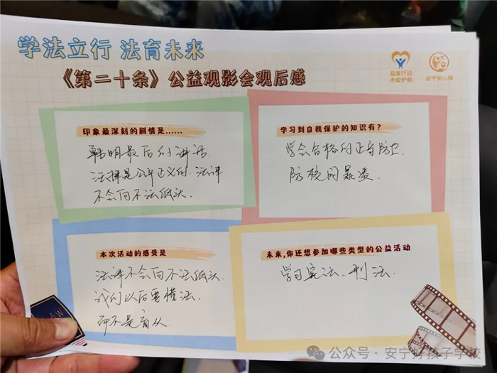 影片雖然結(jié)束了,但法治的種子剛在孩子們的心中扎下了根,同學(xué)們紛紛表示要主動(dòng)將學(xué)到的法律知識(shí)和安全防范知識(shí)分享給身邊的人,學(xué)會(huì)用法律捍衛(wèi)自己的權(quán)力,懂得保護(hù)自己,既不要做施暴者,也不要做受害者,要勇敢正義,做正義之事,勇敢對(duì)校園欺凌和不法行為說(shuō)“不”!