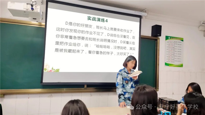 緊接著,張老師首先讓孩子們理解“和而不同”的內(nèi)涵,讓孩子們明白在人與人的相處中,既應當尊重他人的需求與愿望,同時也要堅守個人的界限與原則,清晰界定個人的能力范圍與心理舒適區(qū),避免過度犧牲自我導致的疲憊與不滿。然后通過“如何在拒絕中實踐‘和而不同’案例”,給孩子們傳授了“拒絕寶典”的精髓。