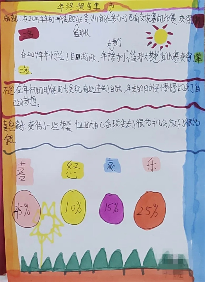 孩子們的“年終報告”各具特色,有的色彩豐富,有的創(chuàng)意十足,有的重點記錄了自己一整年的情緒起伏,有的則記錄了對自己意義非凡的事件,還有的書寫了成長與感悟……