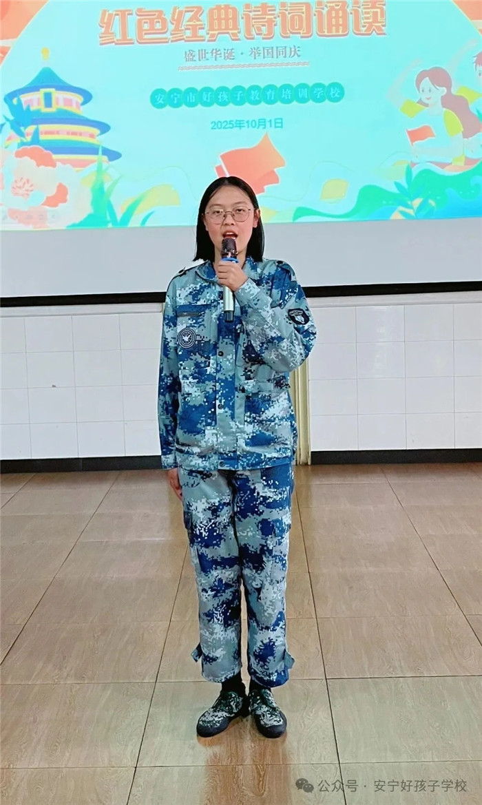 隨后的“紅色經(jīng)典詩(shī)詞誦讀”活動(dòng)同樣精彩紛呈。從《沁園春·雪》的豪邁壯闊,到《七律·長(zhǎng)征》的堅(jiān)韌不屈;從《少年中國(guó)說(shuō)》的朝氣蓬勃,到《我驕傲,我是中國(guó)人》的熱血沸騰...... 同學(xué)們或獨(dú)誦、或合誦,搭配生動(dòng)的肢體語(yǔ)言與情感飽滿的語(yǔ)調(diào),將詩(shī)詞里的紅色故事娓娓道來(lái)。臺(tái)下師生仿佛穿越時(shí)空,在朗朗書(shū)聲中重溫革命歲月,讓紅色文化浸潤(rùn)心靈。